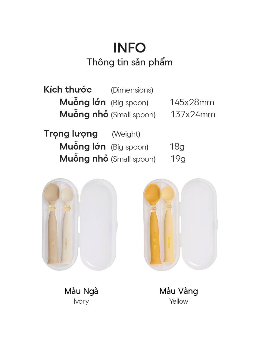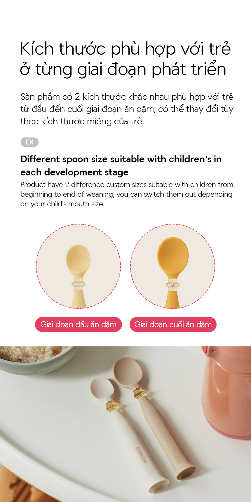 - Kích thước thìa khác nhau phù hợp với trẻ ở từng giai đoạn phát triển. Sản phẩm có 2 kích thước tùy chỉnh khác nhau phù hợp với trẻ từ đầu đến cuối giai đoạn ăn dặm, bạn có thể thay đổi tùy theo kích thước miệng của trẻ.