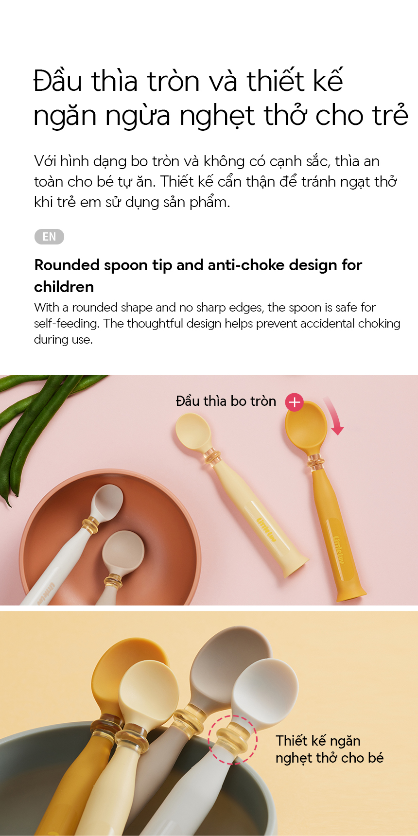 - Hình dáng đầu thìa trònThìa có hình tròn, không có cạnh sắc, an toàn cho trẻ khi tự ăn.