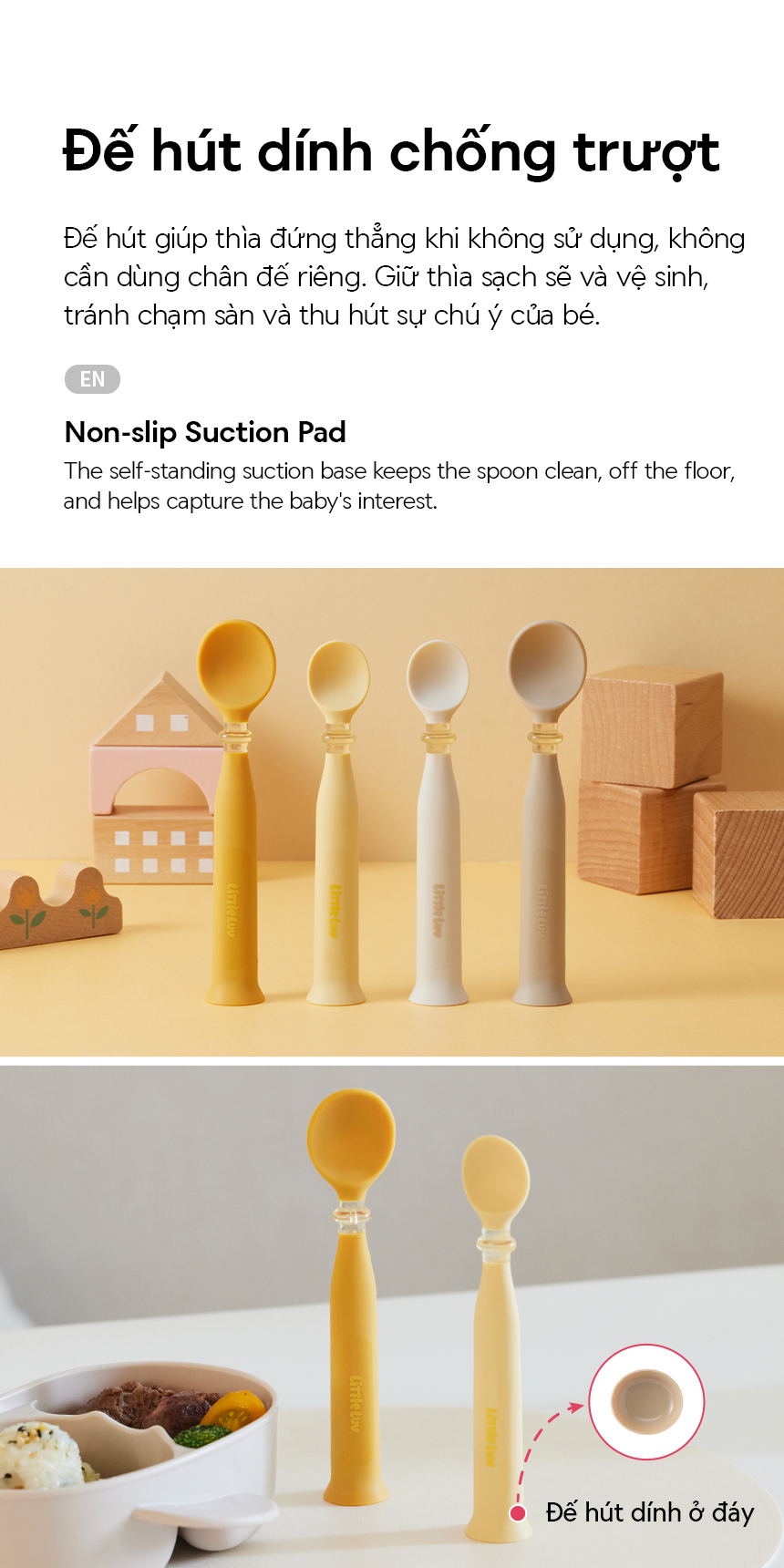 - Đế hút thu hút sự chú ý của trẻ: Đế hút giúp thìa đứng thẳng khi không sử dụng, không cần dùng chân đế riêng. Giữ thìa sạch sẽ và vệ sinh, tránh chạm sàn và thu hút sự chú ý của bé.